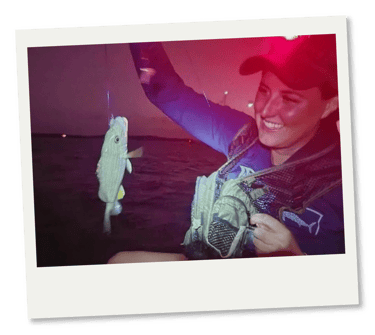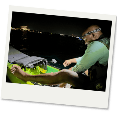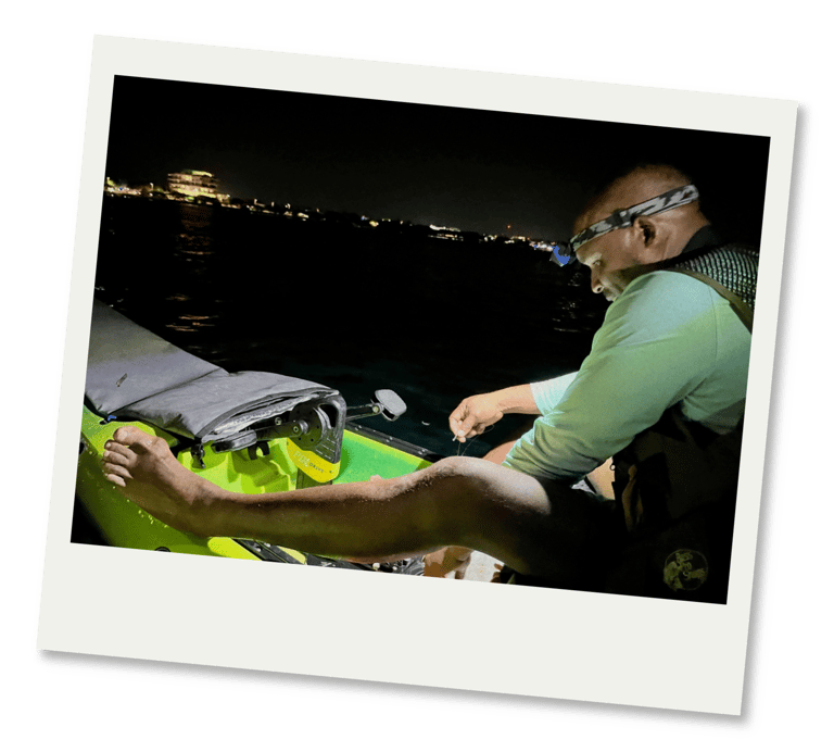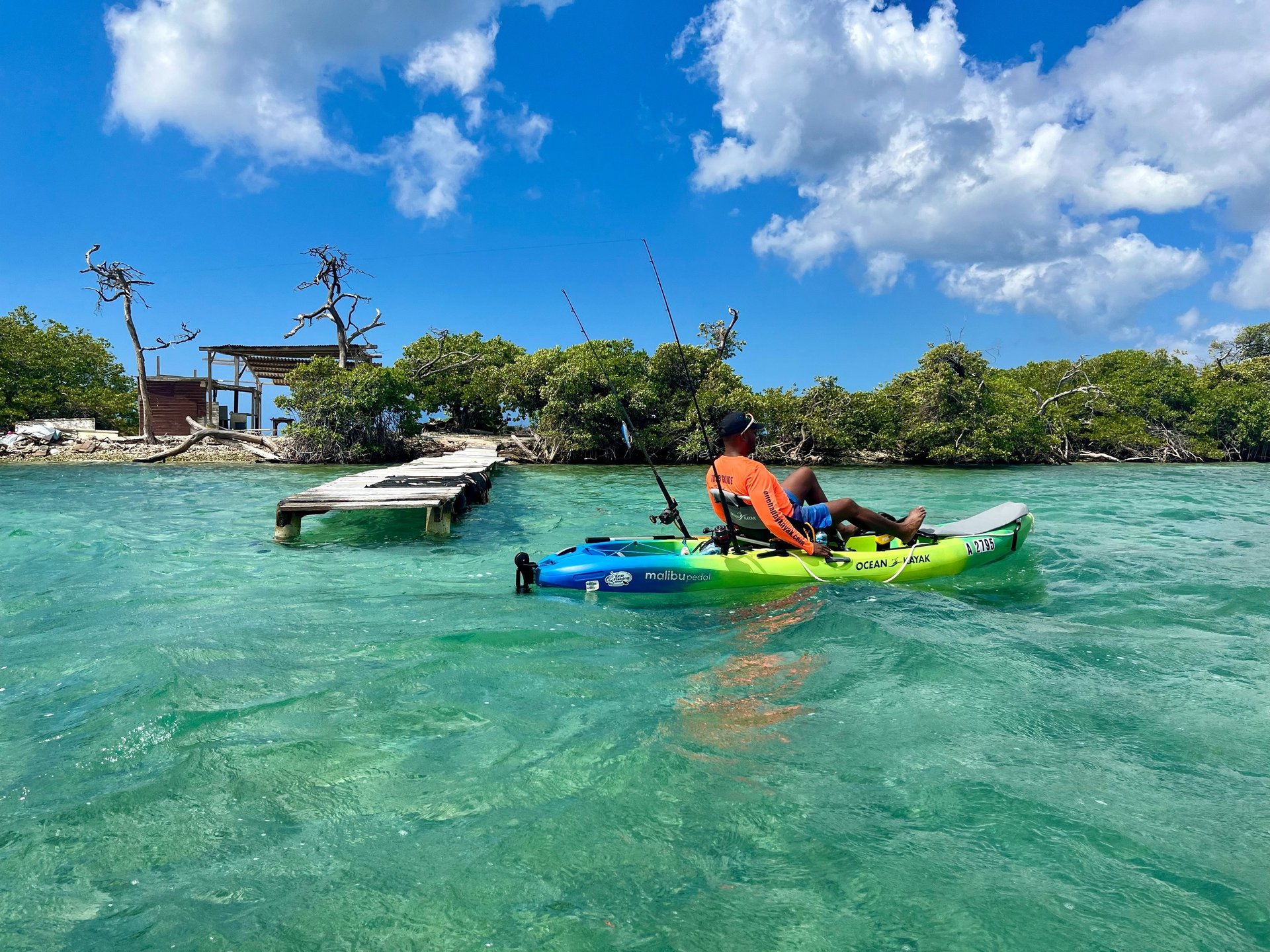 We launch from the West Deck area and paddle about half a mile offshore, each guest in their own foot-pedal kayak. From there, we explore different fishing spots in calm coastal waters.
