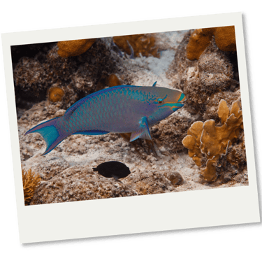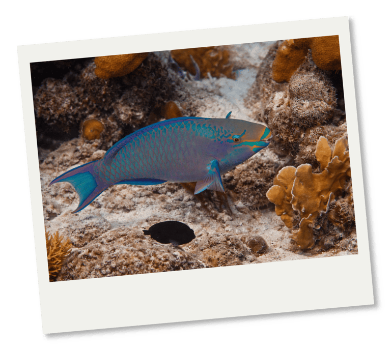 Parrotfish drift through coral gardens.